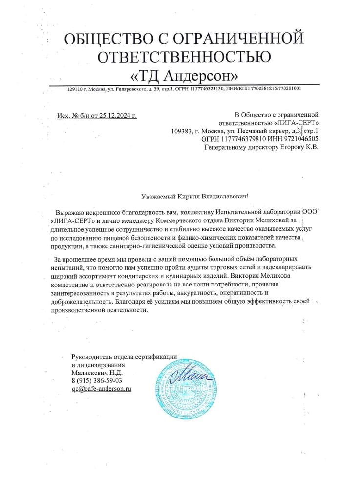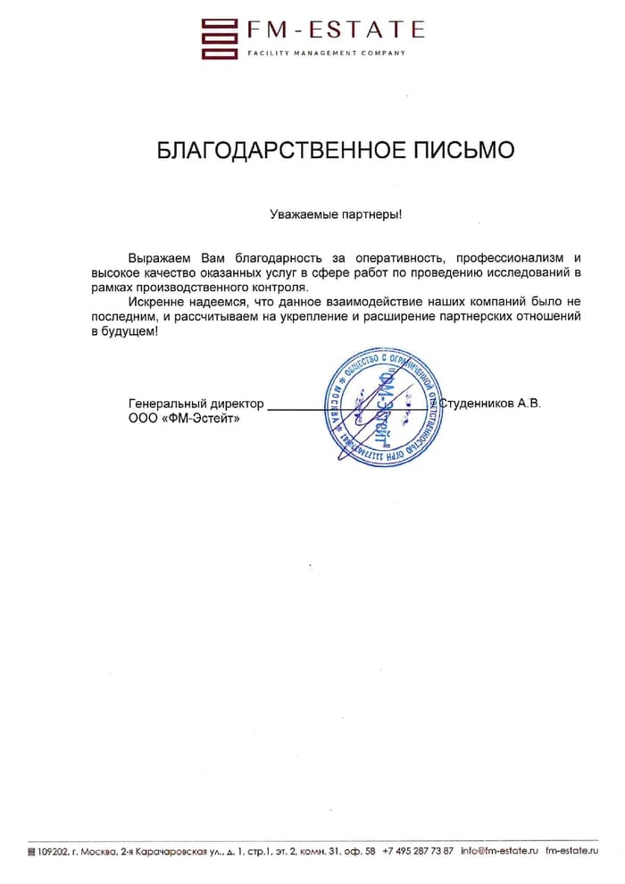 Доверие партнеров — главная оценка нашей работы Мы сотрудничаем с производителями, пищевыми предприятиями и научными центрами, для которых точность и надежность — обязательные условия работы. Отзывы и благодарности от компаний-клиентов подтверждают: наша лаборатория соответствует самым строгим стандартам. Здесь — реальные мнения от тех, кто уже доверил нам свои исследования.